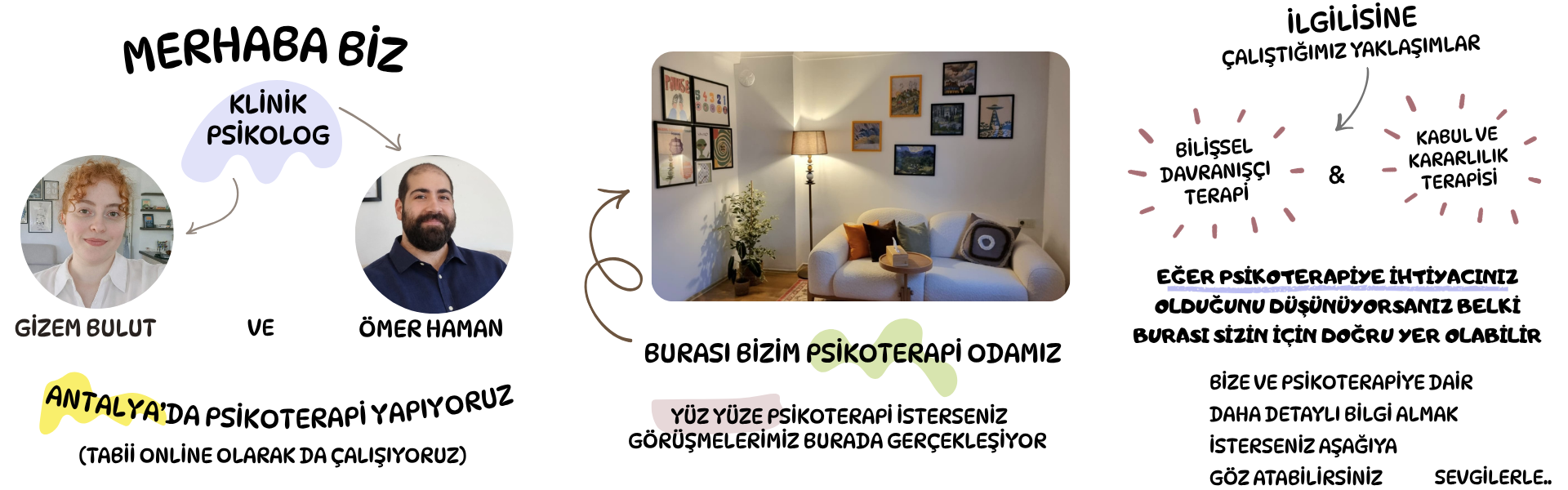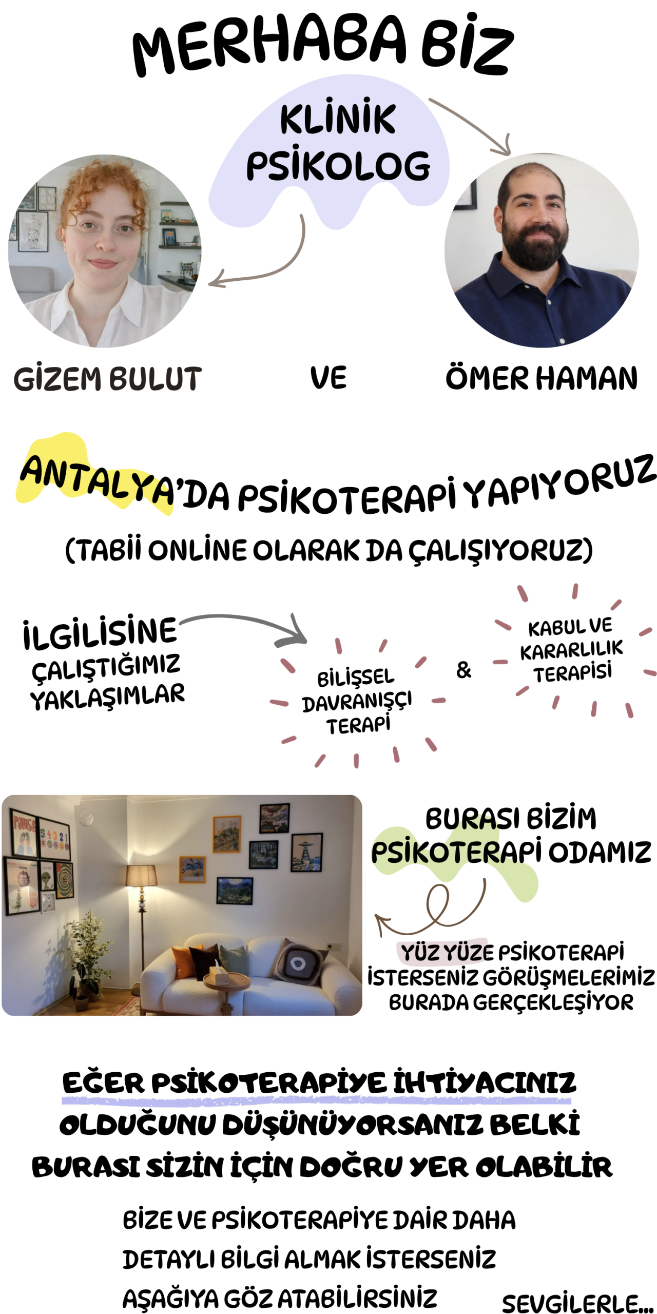 Randevu almak isterseniz, aklınıza takılan bir şey varsa ya da sadece merak ediyorsanız bize ulaşabilirsiniz.